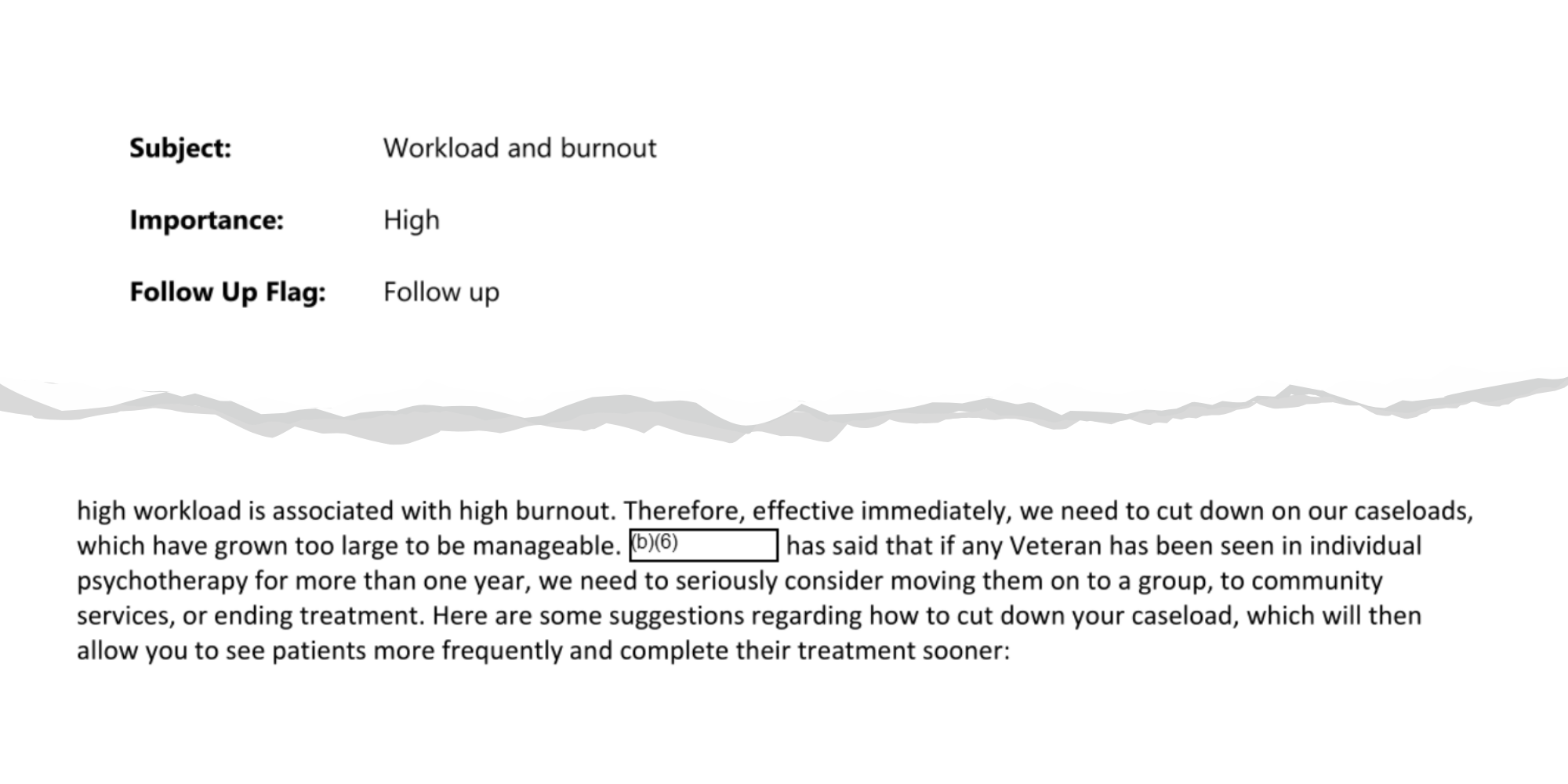 In September 2024, a psychology program manager at the Central Virginia VA Health Care System sent an email to several staff members. The subject: workload and burnout. The importance: high. In the email, the program manager stated that, since there would be virtually no new staff positions in fiscal year 2025, new strategies would be implemented to treat patients. “Effective immediately, we need to cut down on our caseloads, which have grown too large to be manageable,” they wrote.