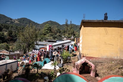 As Miguel’s hearse moves through the Nebaj cemetery, journalist Mario López, from the Megavisión news outlet, broadcasts the burial live on Facebook. “Family members in the U.S. request this service so they can participate from afar,” he explains, as he walks ahead among the burial mounds.