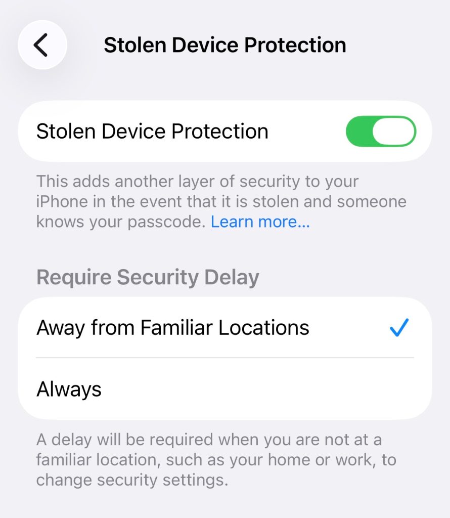 It also enacts a one-hour security delay before users can change critical security settings. Designed to give victims time to mark an iPhone as lost (and wipe it) before a thief can make changes. This can be set to “Always” or “Away from Familiar Locations.”