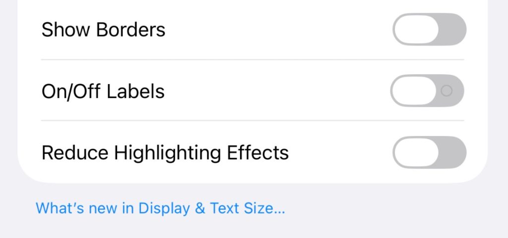 In the Accessibility menu in Settings, Apple has added a new toggle under Display & Text Size: “Reduce Highlighting Effects.” This should reduce some of the effects around the edges of buttons and sliders.
