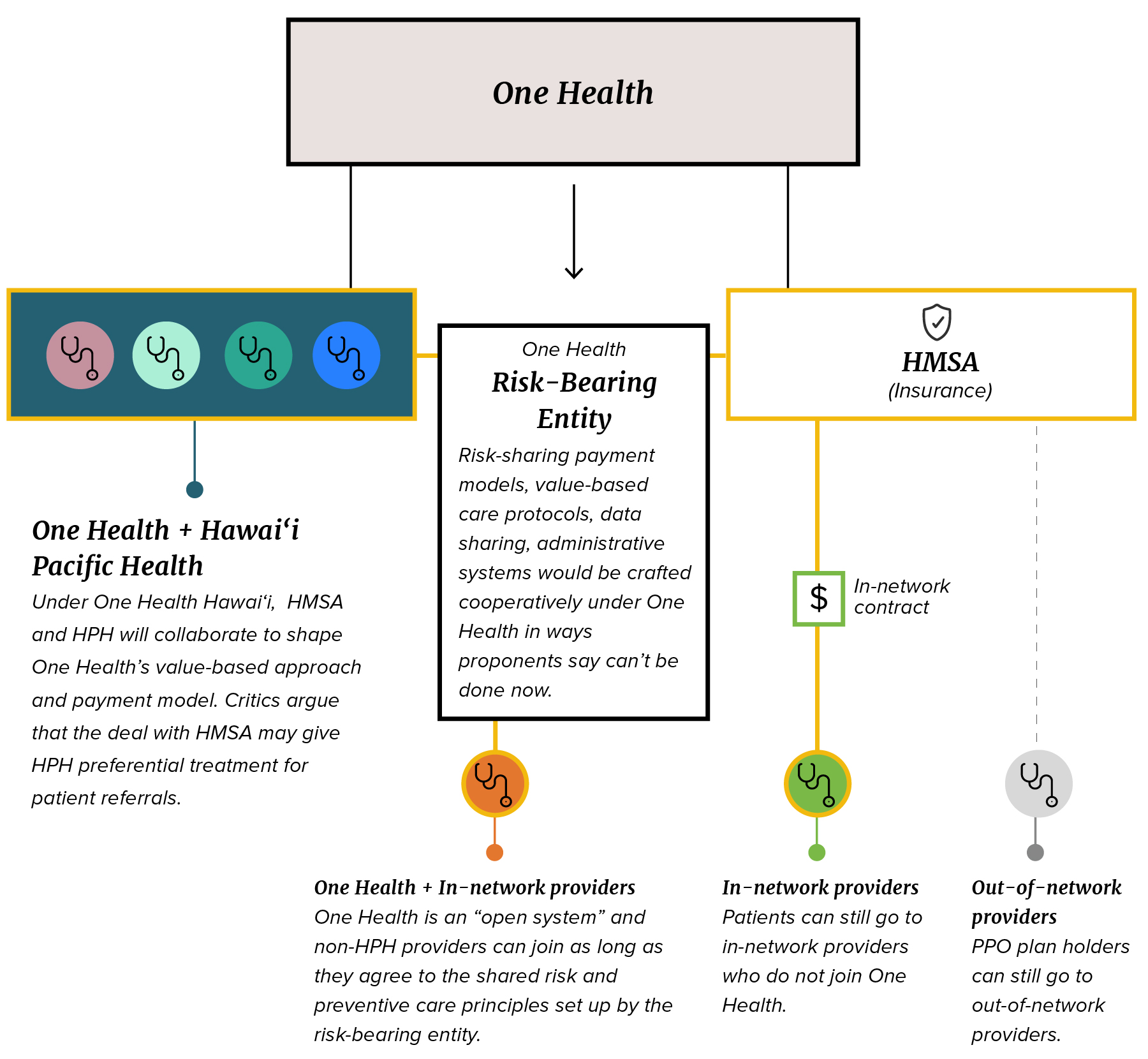 The One Health proposal is not a merger — HMSA and HPH will continue as separate entities but collaborate through what they call a “risk-bearing entity.” HMSA members should be able to keep seeing the doctors they want, but to be part of HMSA’s network, doctors outside of HPH will have to continue to negotiate separate contracts with HMSA.Other doctors and hospitals will be able to join One Health as long as they adopt its policies for sharing risk and caring for patients.Some believe Hawaiʻi’s neediest residents could lose access to critical health care if the deal goes through.