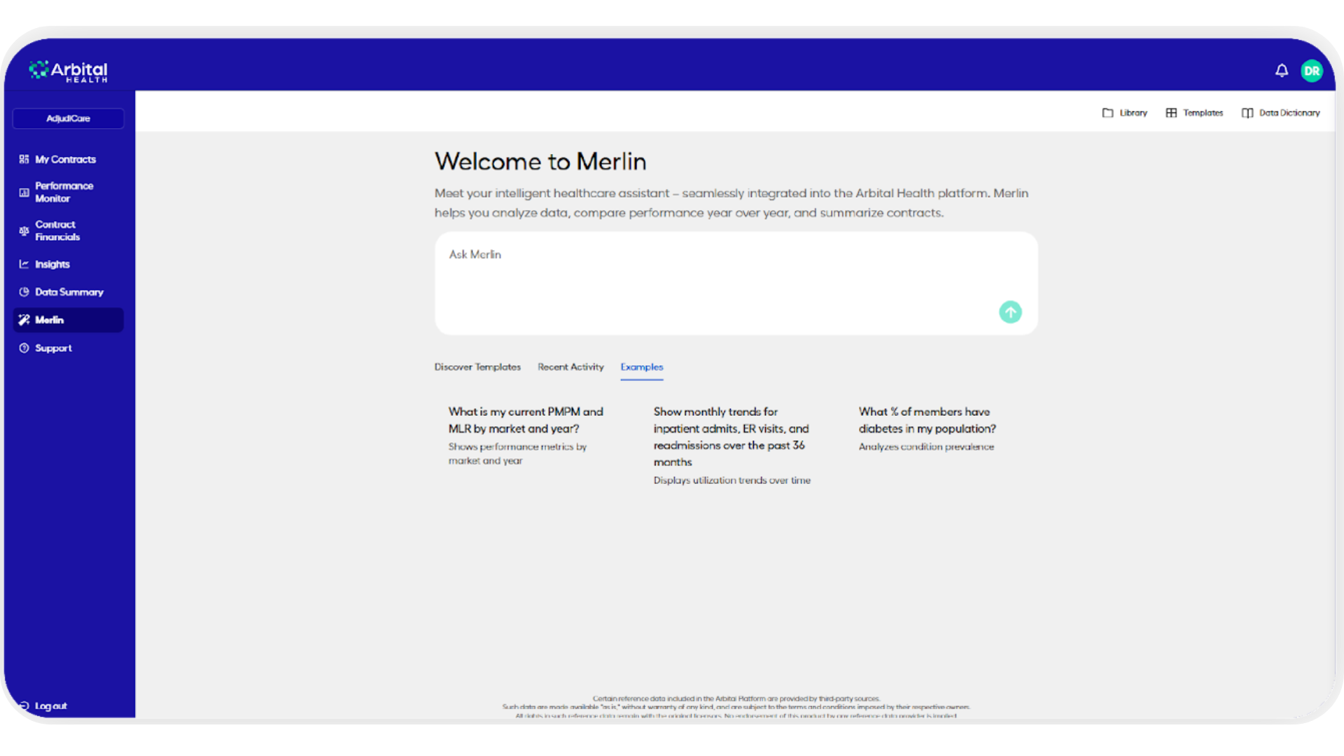 The platform reads and structures your contracts, extracts every financial parameter (MLR targets, PMPM thresholds, risk corridors, quality gates, shared savings splits), and aligns them with Arbital’s validated actuarial and predictive models. From there, you can ask Merlin AI nuanced questions in plain language. Here are some real-time queries users have made in the past to get actionable results: