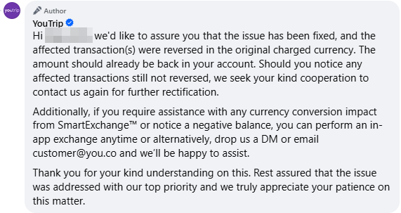 In response to the comment, YouTrip has reassured the user that the issue has been resolved, and reversal payments will be processed for all users affected.
