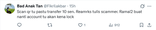 Perhaps this is why it is not being adopted by the other thieves out there. Towards this thought, netizen @Fikrilakbar suggested that people scan the QR and transfer only 10 sen. They will then write the word, “scammer” there in the remark section, prompting the account to get locked up.