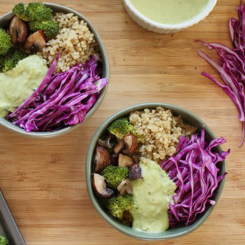 In a vegan riff on green goddess dressing, cashews provide a creamy base with tons of flavor from herbs and apple-cider vinegar. Drizzle it all over this bowl of quinoa and roasted vegetables to make a satisfying vegan dinner or easy packable lunch that is ready in just 30 minutes.