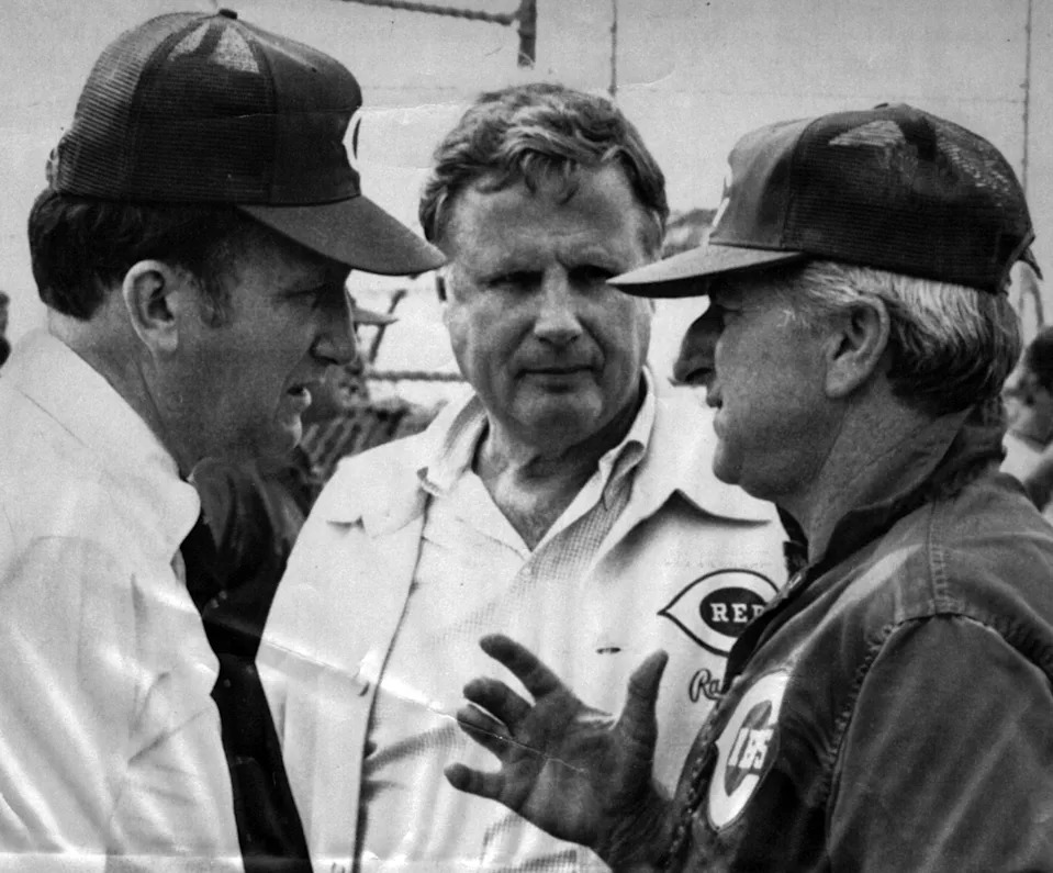 MARCH 2, 1982: Cincinnati Reds manager John McNamara, right, talking baseball with Notre Dame head football coach Gerry Faust, left, as he visited the Reds’ spring training camp in Tampa, Fla. Richard Wagner, president and chief executive officer of the Reds, center, joined the discussion.