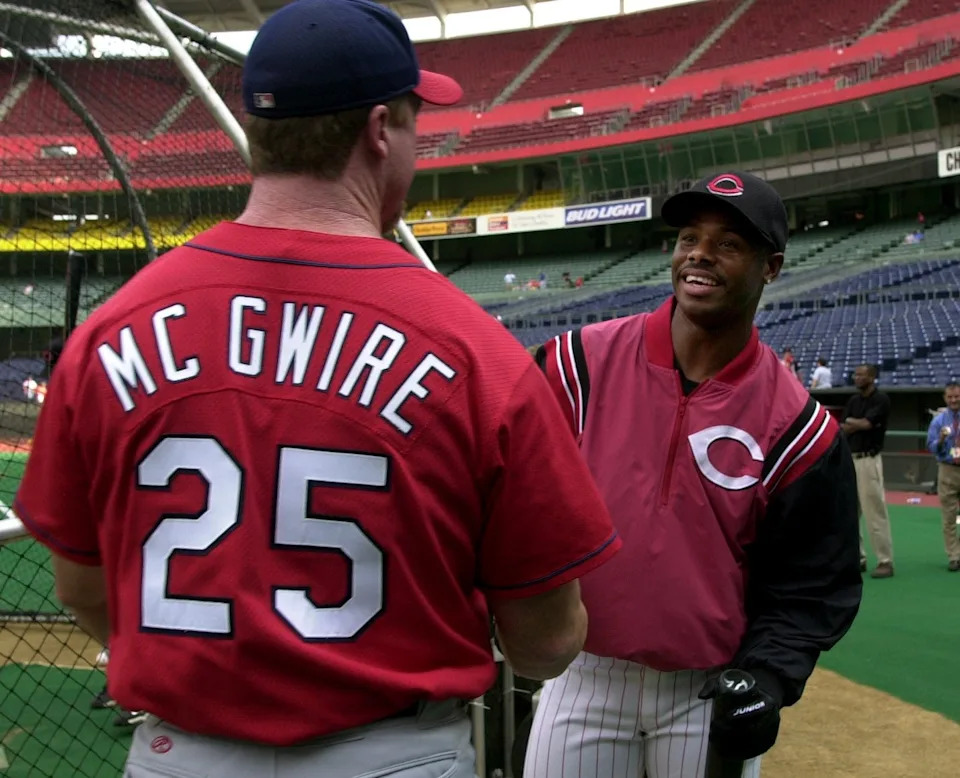 May 5, 2000: Cincinnati Reds outfielder Ken Griffey Jr. and St. Louis Cardinals first baseman Mark McGwire greet each other during batting practice at Cinergry Field.