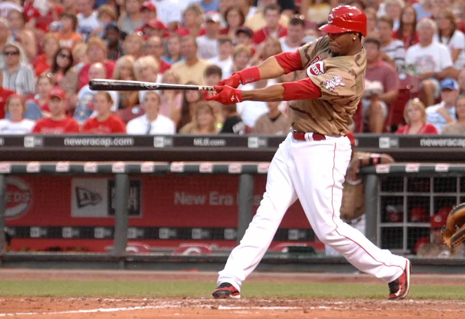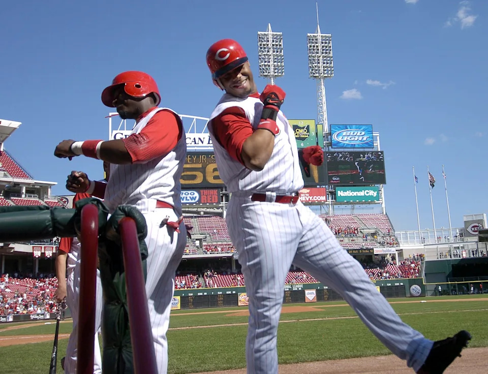 September 25, 2006: Ken Griffey Jr. bumps elbows with Brandon Philips as he returns to the dugout after his go-ahead three-run pinch hit homer. The Reds defeated the Chicago Cubs 5-4 to close out the home season at Great American Ball Park.