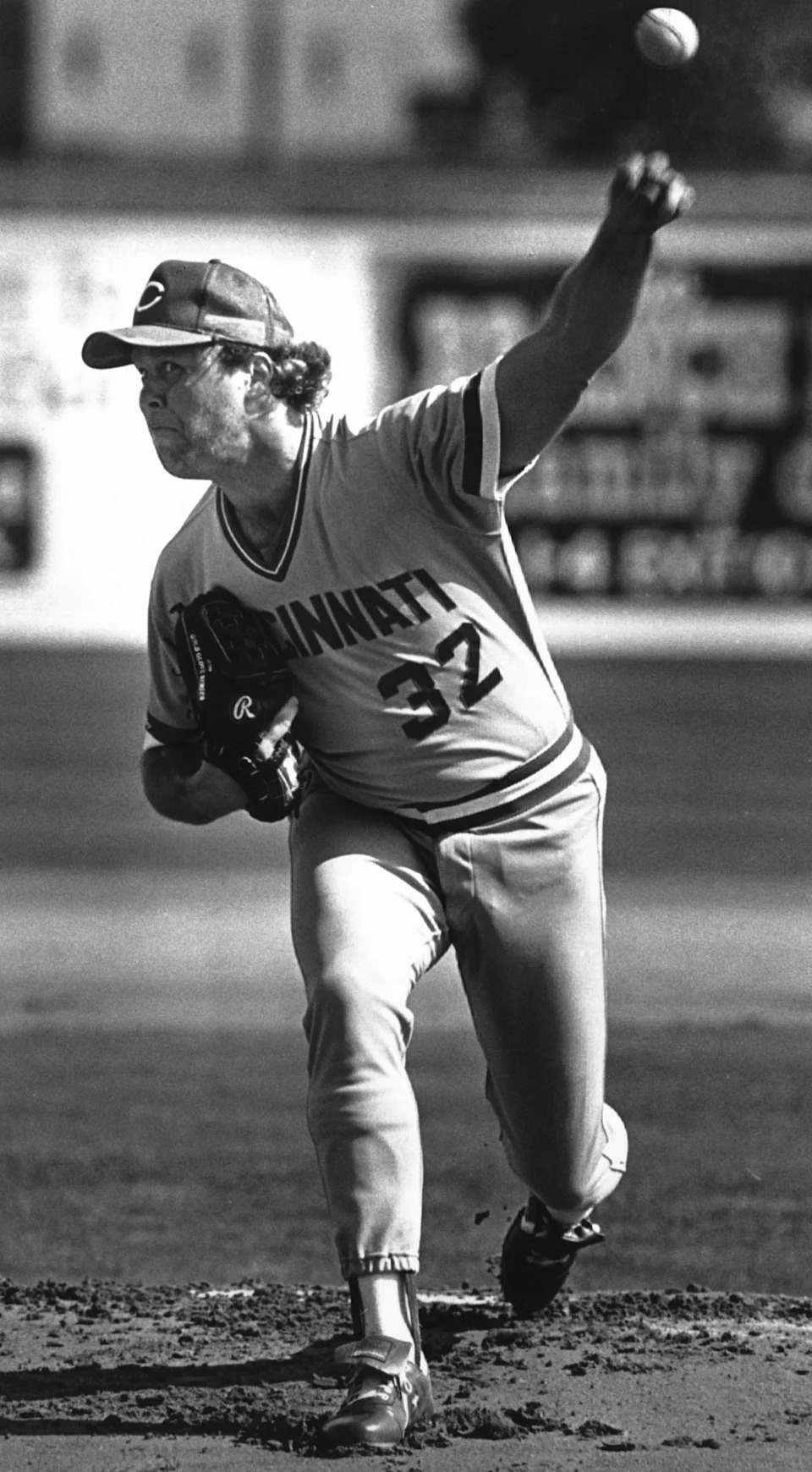 MARCH 9, 1982: Jose Brito’s fastball is a fuzzy blur in the camera’s eye as it speeds plateward during a spring training workout in Tampa, Fla. Watching the Reds rookie are Charlie Leibrandto (left), Mike LaCross (51) and Rick O’Keeffe (58).