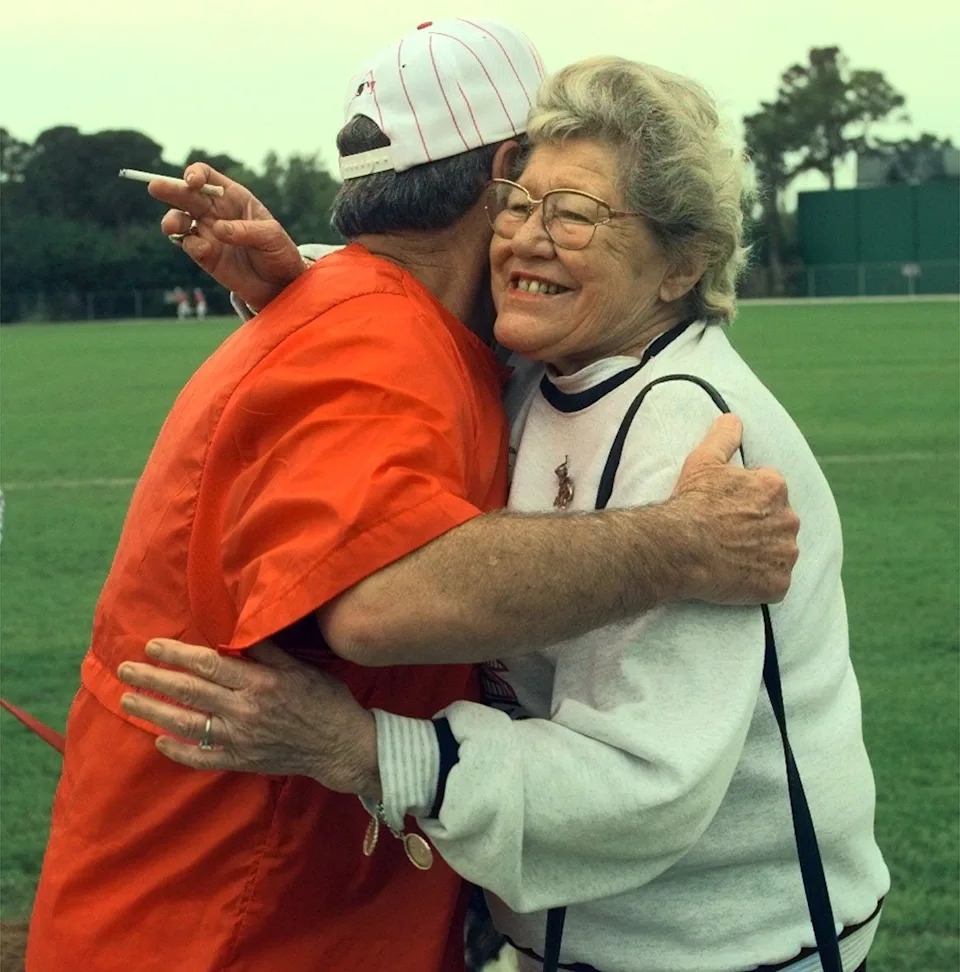 February 27, 1998: Reds owner Marge Schott gets a hug from manager Jack McKeon at the Reds new spring training camp in Sarasota.