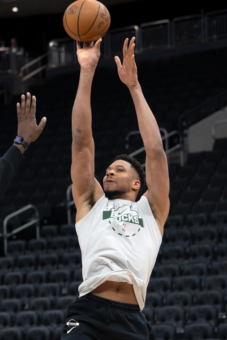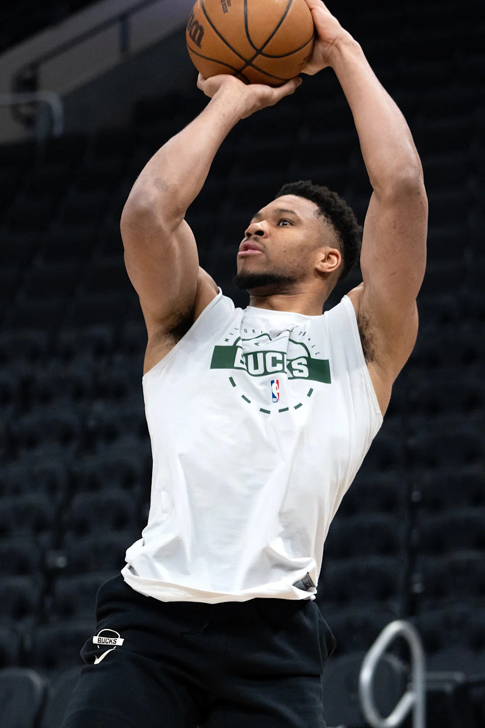 Bucks forward Giannis Antetokounmpo warms up before the team’s game March 2 against the Boston Celtics at Fiserv Forum.