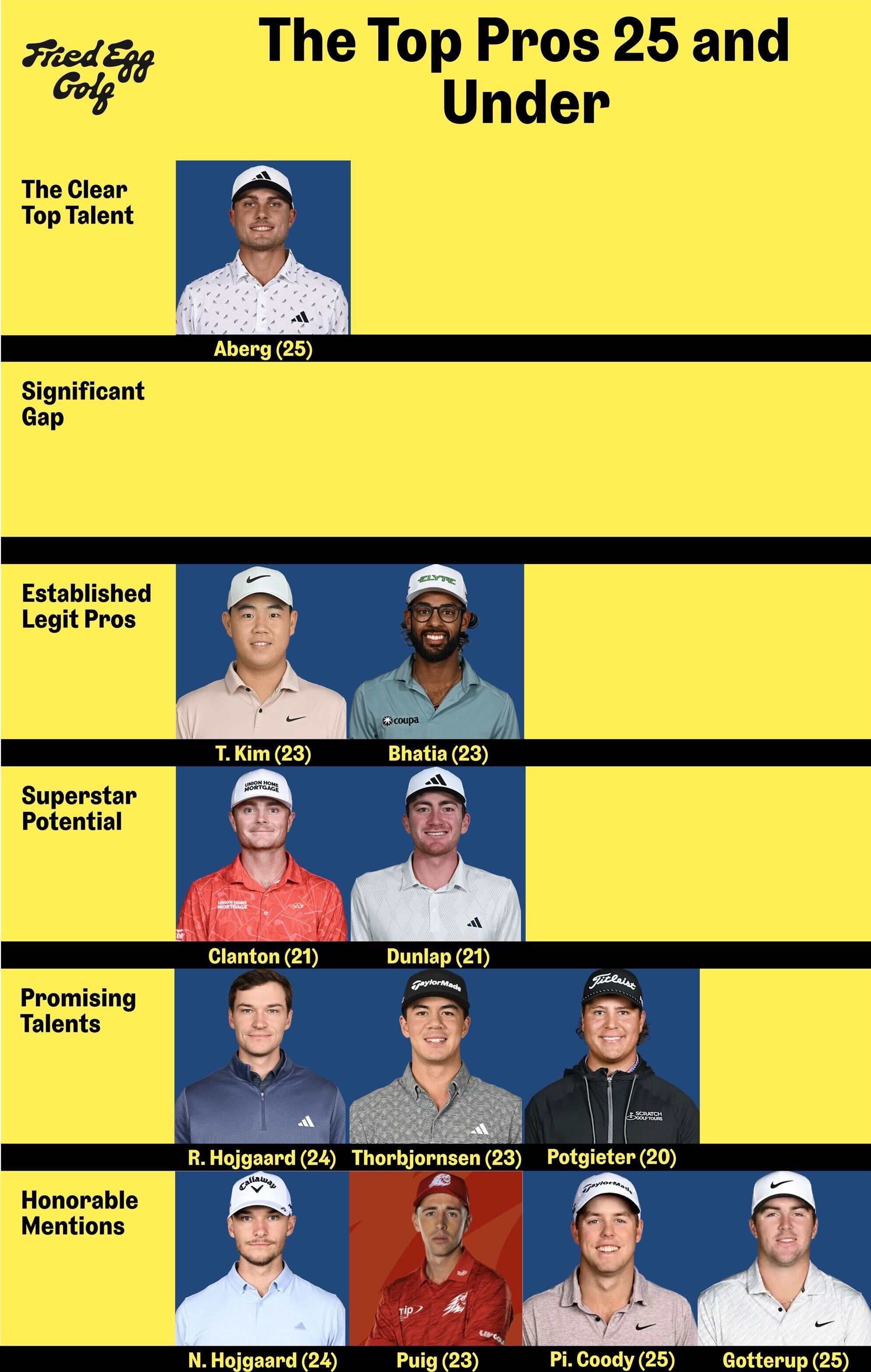 I do not believe in tiering amateur golfers in this exercise. Amateurs should be given the grace to develop without too much scrutiny before turning professional. That said, if I were including amateurs, Jackson Koivun would be tiered very high on this list.