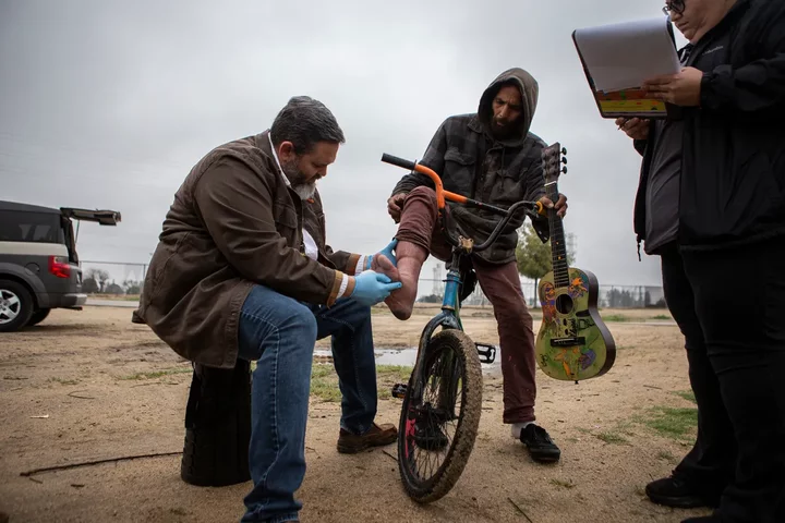 Dr. Matthew Beare examines a patient’s foot at a meeting area near the Kern River on March 16, 2023. Photo by Larry Valenzuela, CalMatters/CatchLight Local