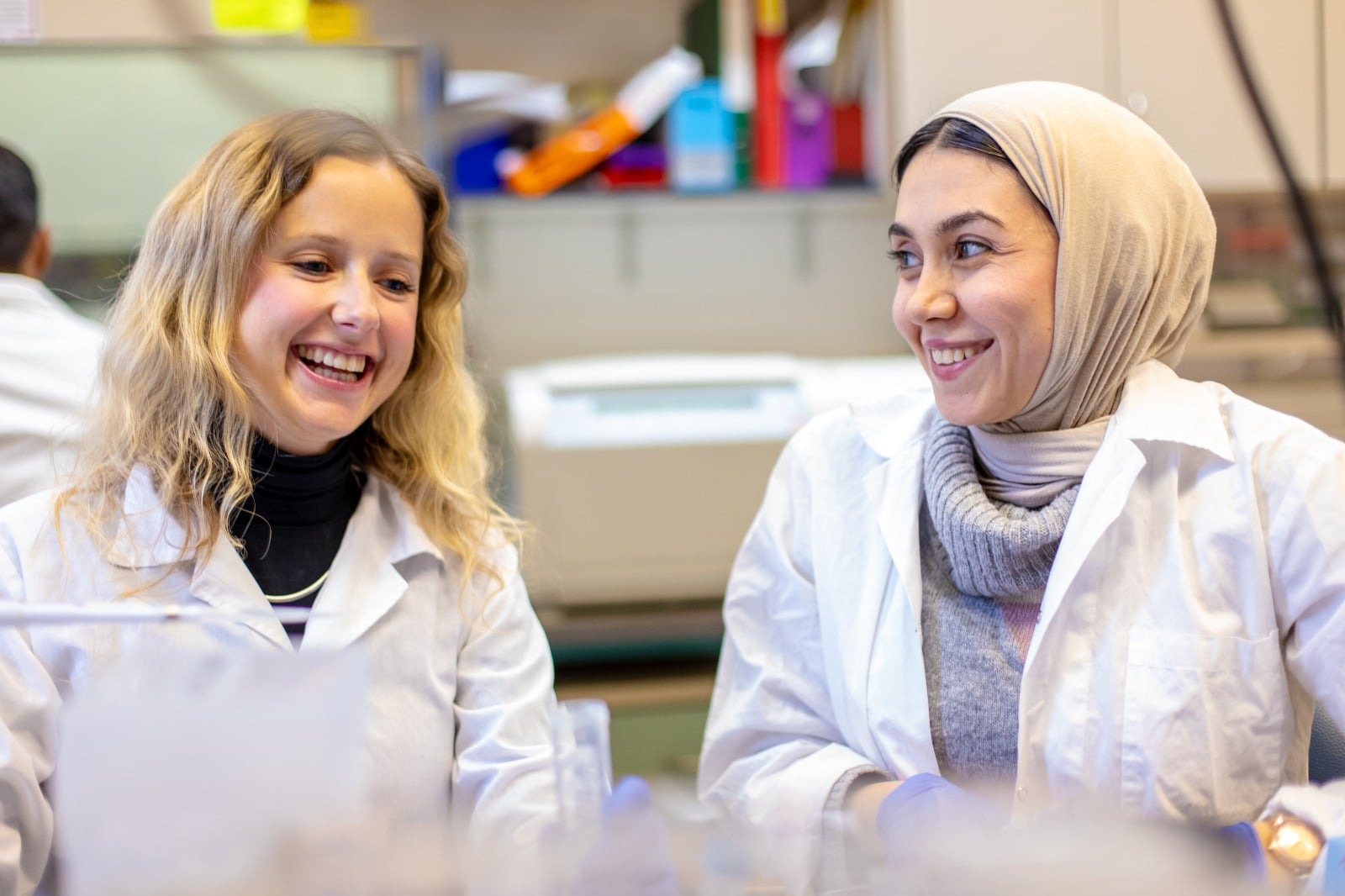 PhD student Radka Kočvarová, left, and Sharleen Hamad, members of Prof. Yossi Tam’s lab at the School of Pharmacy at the Faculty of Medicine of the Hebrew University of Jerusalem. (Courtesy)
