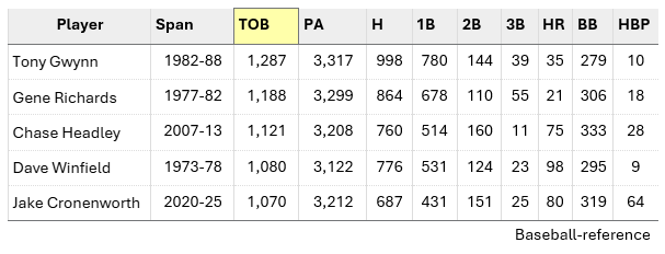 Cronenworth sees as many pitches as almost anyone — 3.99 per plate appearance, more than all but 18 players since 2020. He puts 40% of the pitches he swings at in play, more than all but 41 players over the past six seasons. He gets on base as much as almost anyone — 1,070 times since his debut, more than all but 34 players in that span. (That is also fifth most by any player in franchise history in the first 781 games of his career.)