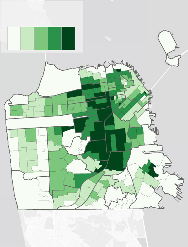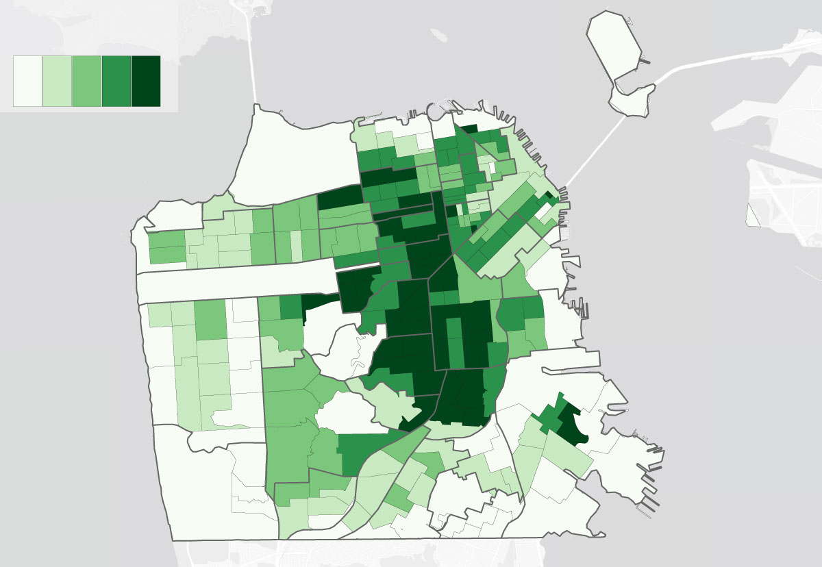 Note: Data only includes street trees maintained by the Department of Public Works. Source: S.F. Open Data. Map by Kelly Waldron.