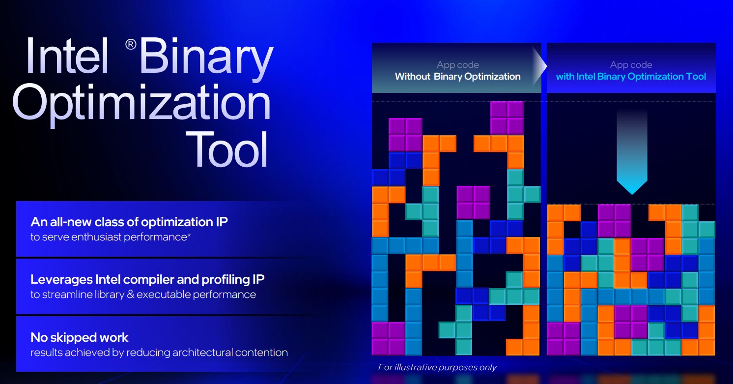 Other than the Binary Optimization Tool, Intel writes that the specific advancements here in Arrow Lake Refresh are four more efficiency cores, a 200MHz faster base clock on the P-cores and a 100MHz faster base-clock on the E-cores, a 900MHz faster link between the CPU and memory controller, support for DDR5 7200 MT/s memory, and “early support” for 4-rank CUDIMM memory modules, assuming your Intel 800-series motherboard supports those.