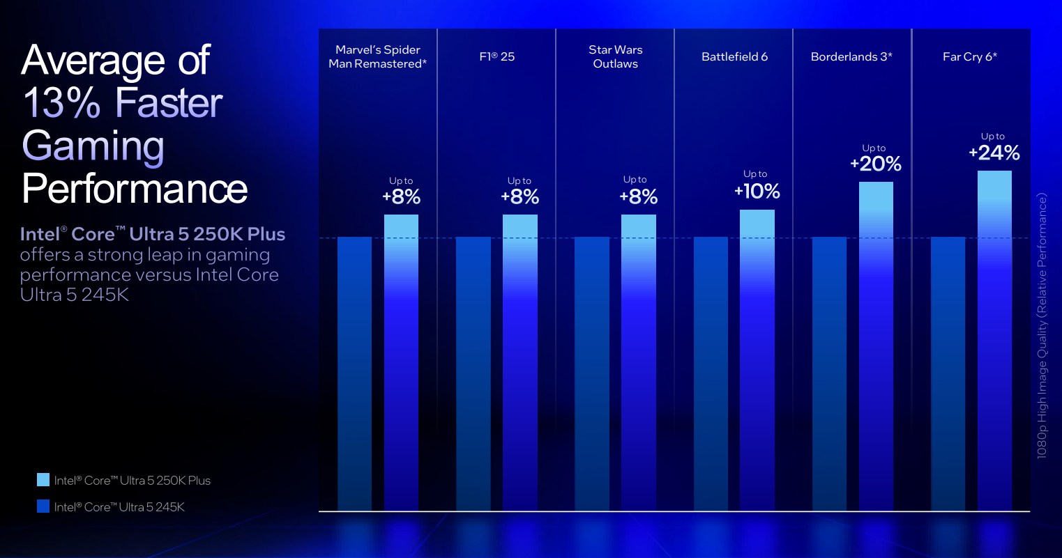 Intel’s slidedeck doesn’t actually show how much faster gaming performance might be compared to its previous flagship chips, let alone AMD’s chips — instead, Intel compares the 270K Plus and 250K Plus directly to their immediate predecessors, the 265K and 245K, respectively.