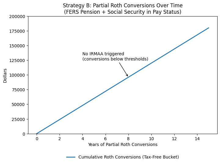 Rather than pursuing a single large conversion, Strategy B uses modest annual conversions deliberately sized to remain below IRMAA thresholds. Over time, meaningful assets are shifted into Roth accounts, creating tax-free flexibility later in retirement. RMD pressure declines gradually, without triggering Medicare premium increases along the way.
