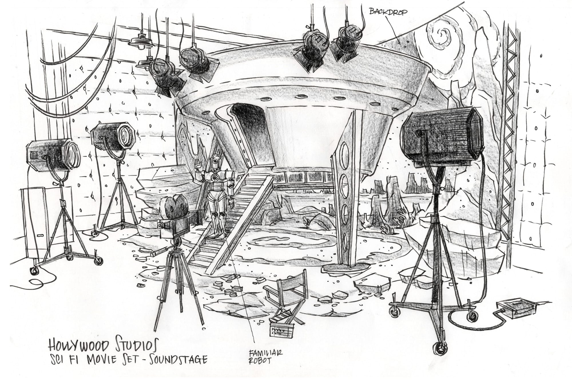 Don Carson: Probably my absolute favorite part of the process is the research part and I tend to research by drawing it and so I got to do a lot of research on the sort of vintage equipment that was used. So the editing machinery, the Foley and sound props. That was my favorite bit is the you know what are we going to fill this with? Always with this sort of keeping in mind what the audience is going to experience. You want to give them something that’s going to be interesting. Kind of make them want to go find out more about it, but also you don’t want to to be wrong. You don’t want to foolishly recreate a Venice that doesn’t exist. You want it to be something that people go, “Yeah, that’s how I felt when I was there.”
