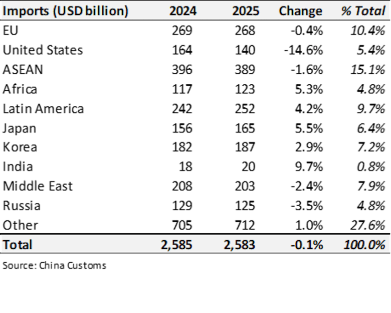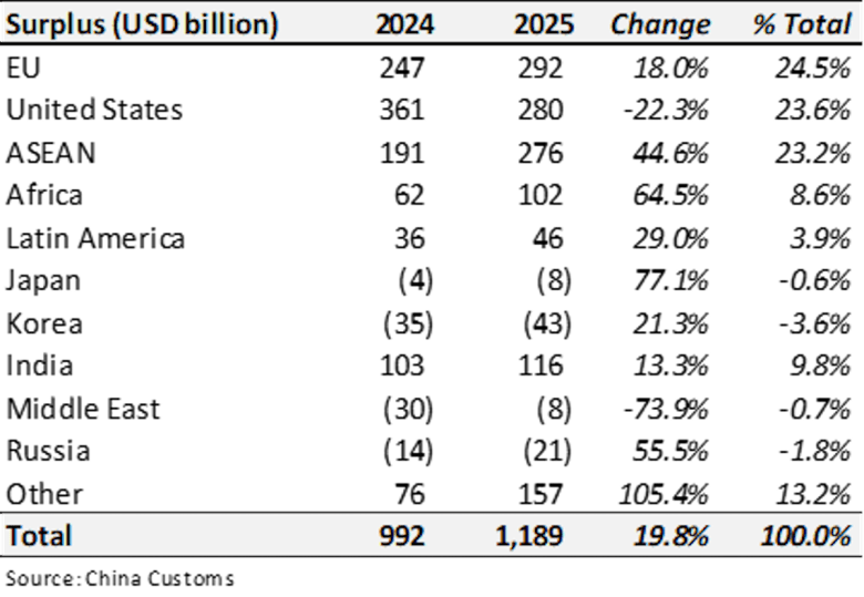 China set off alarm bells after its 2025 trade surplus grew 20% year-on-year to $1.2 trillion, in defiance of Trump tariffs. China’s 2025 exports increased 5.4% while its already low imports fell marginally. The 20% collapse in exports to the US was more than offset by growth everywhere else – particularly Global South countries with exports to ASEAN and Africa surging 13% and 26%, respectively.