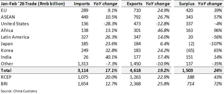 Concerns were compounded by January and February 2026 data showing that China’s exports increased 22% in dollar terms (19% in Rmb terms). Exports to the EU, ASEAN and Africa rocketed 25%, 27% and 47%, respectively.