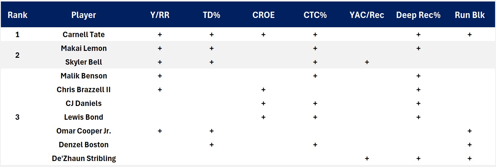Carnell Tate tied for the lead with Malik Benson in Catch Rate and Passer Rating (P Rtg) on targets over 20 yds. But Tate clearly separates from the rest of the pack on balance of production and productivity stats on deep balls, including some I didn’t show in the table.