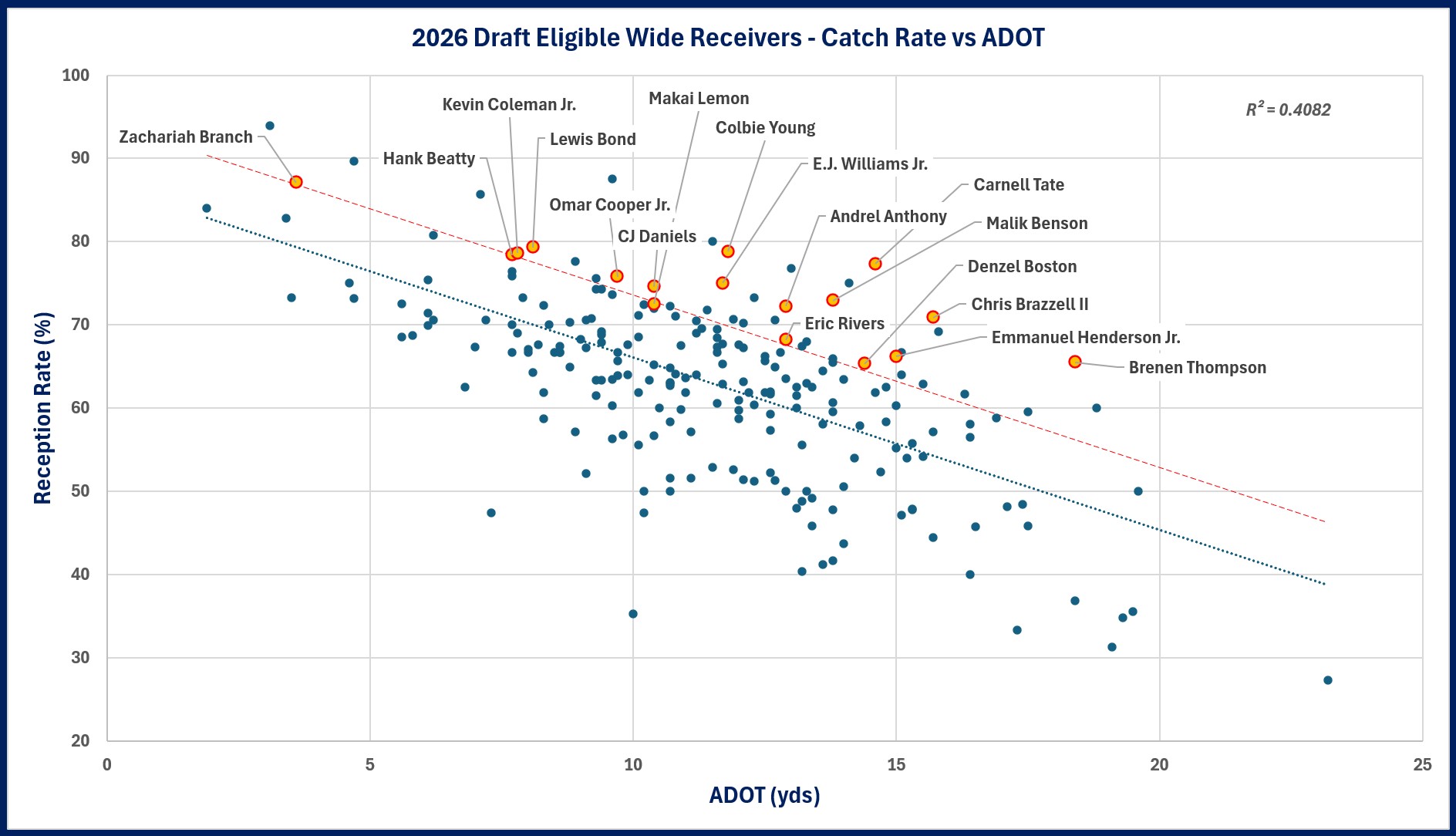 To illustrate what I mean, the following graph plots Reception Rate as a function of ADOT for 223 draft-eligible NCAA WRs who logged more than 100 pass plays in 2025.