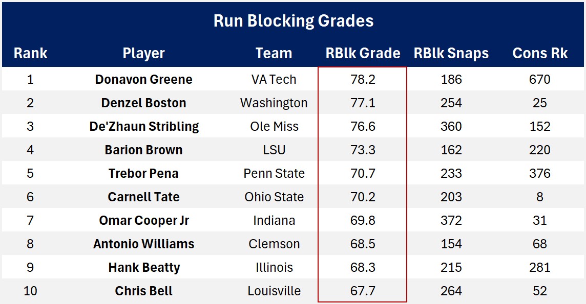 Run blocking is an important, and often overlooked, aspect of playing WR. Sadly, I haven’t found any truly satisfying run blocking metrics for football players in general, let alone college football players. So I made do with PFF Run Blocking Grades because they were available.