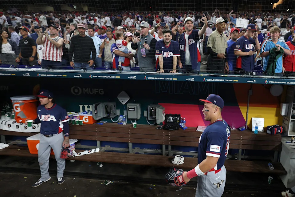 MIAMI, FLORIDA – MARCH 15: Aaron Judge #99 of Team United States looks on from the dugout after the 2-1 victory against Team Dominican Republic at loanDepot park on March 15, 2026 in Miami, Florida. (Photo by Al Bello/Getty Images)