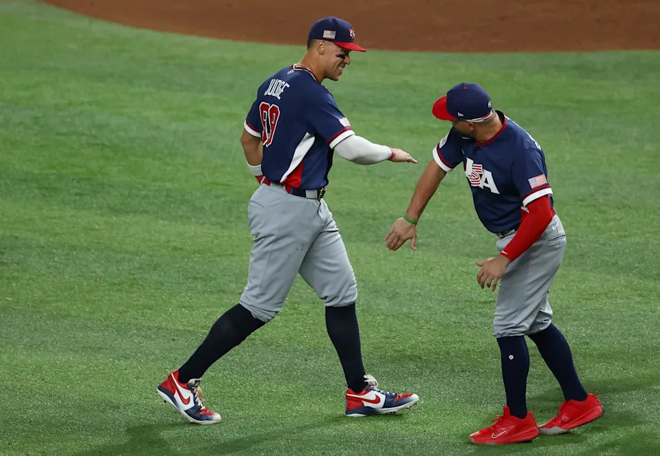 MIAMI, FLORIDA – MARCH 15: Aaron Judge #99 of Team United States celebrates with Brice Turang #13 and Bobby Witt Jr. #7 after the 2-1 victory against Team Dominican Republic at loanDepot park on March 15, 2026 in Miami, Florida. (Photo by Megan Briggs/Getty Images)