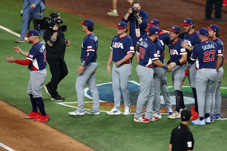 MIAMI, FLORIDA – MARCH 15: Members of Team United States celebrate after the 2-1 victory against Team Dominican Republic at loanDepot park on March 15, 2026 in Miami, Florida. (Photo by Megan Briggs/Getty Images)