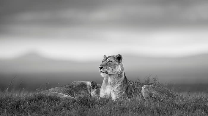 The scene is one of nature’s everyday realities—where life and death are part of the same cycle. The photograph’s monochrome tones focus attention on the textures and forms, highlighting the lion’s face, the buffalo’s rugged hide, and the characteristic shape of its horns. It’s a calm moment after the intensity of the hunt, reflecting the balance of survival in the wild.