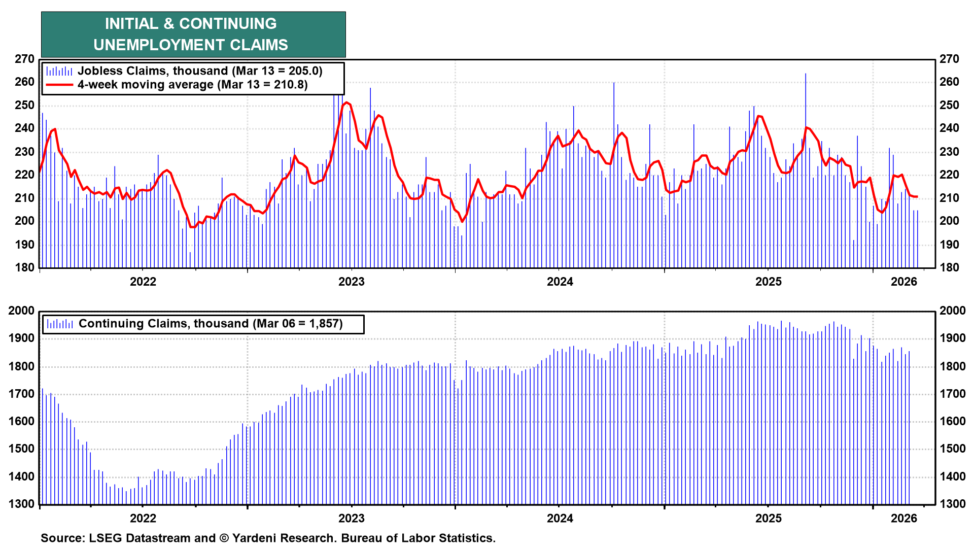 (4) Jobless claims. Weekly unemployment insurance claims remain upbeat, as claims continue to moderate (chart). Any reading in the neighborhood of last week’s 205,000 level would confirm that layoffs remain low.