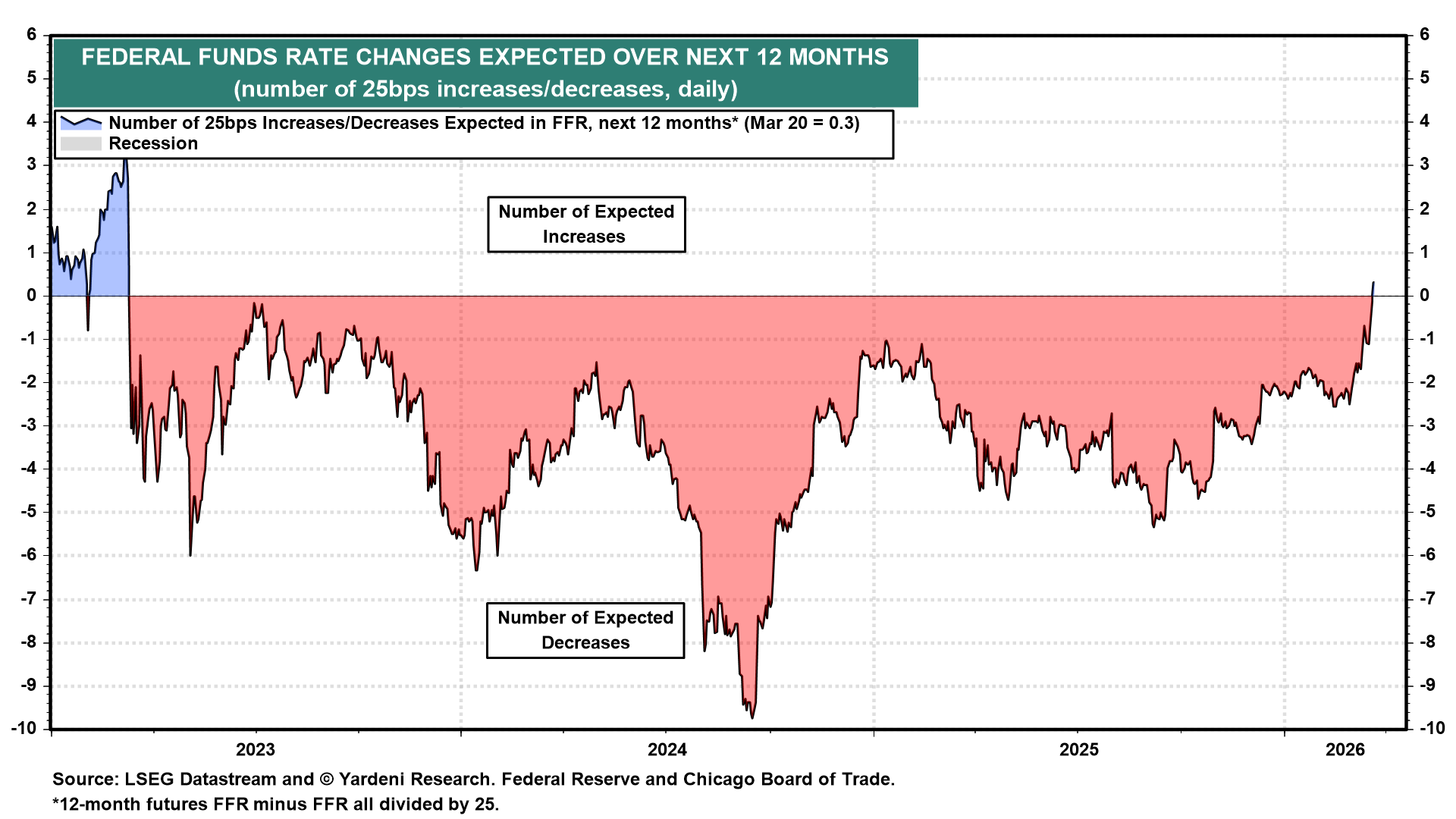Following last week’s Federal Open Market Committee meeting, Fed Chair Jerome Powell reiterated that further evidence of easing inflation is required before the Fed considers injecting liquidity into the economy. “If we don’t see that progress, then you won’t see the rate cut,” he said. The federal funds futures market now implies no rate cuts over the next 12 months (chart).
