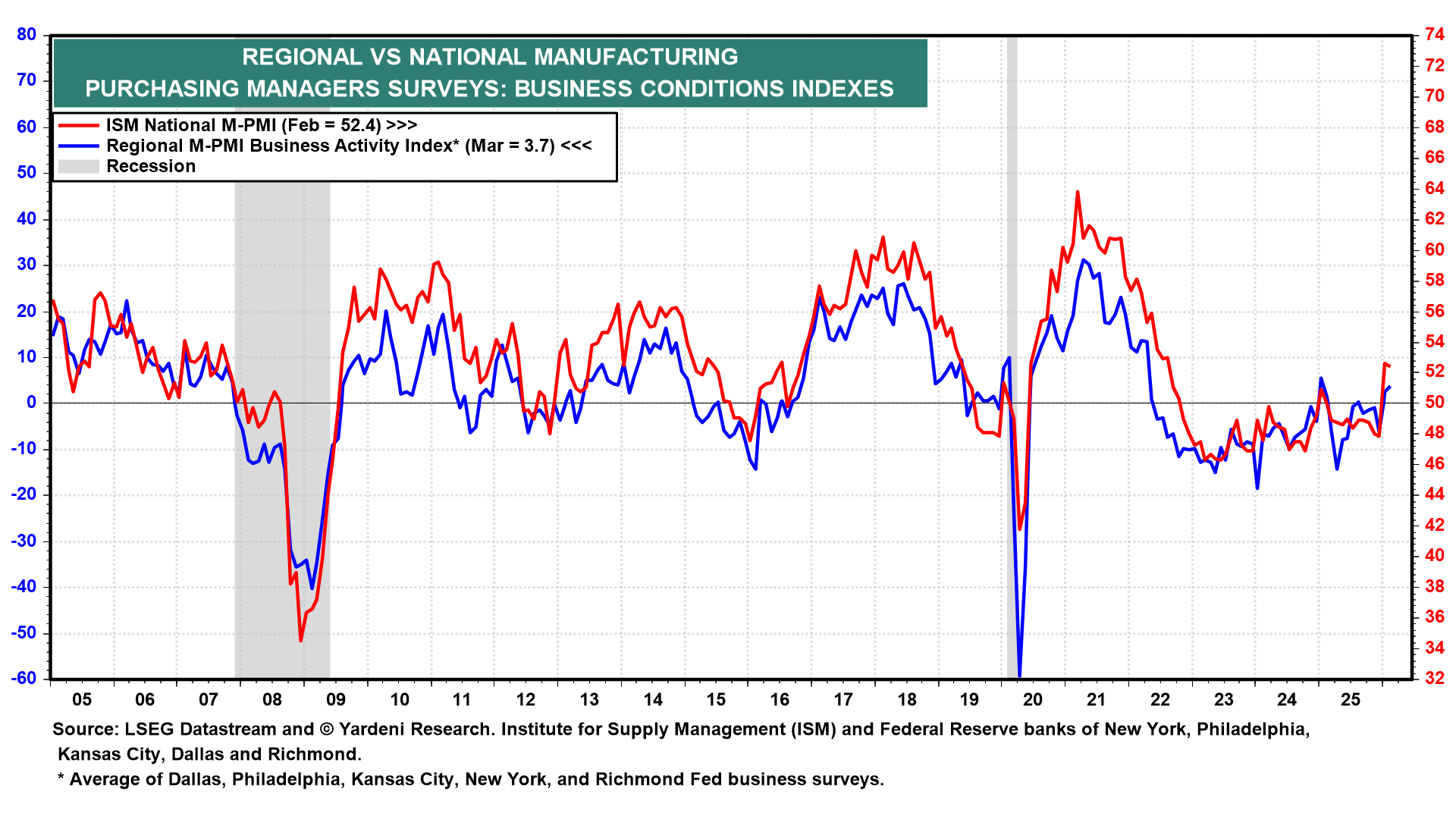 (3) Business surveys. At a moment when Fed officials are scrambling to keep up with economic zigs and zags, regional surveys should garner extra attention (chart). We’ll hear from the Chicago Fed (Mon), the Richmond Fed (Tue), and the Kansas City Fed (Thu). Also, S&P Global releases its March purchasing managers’ indexes (Tue) for both manufacturing and services. The impact of the war on the economy may become observable.