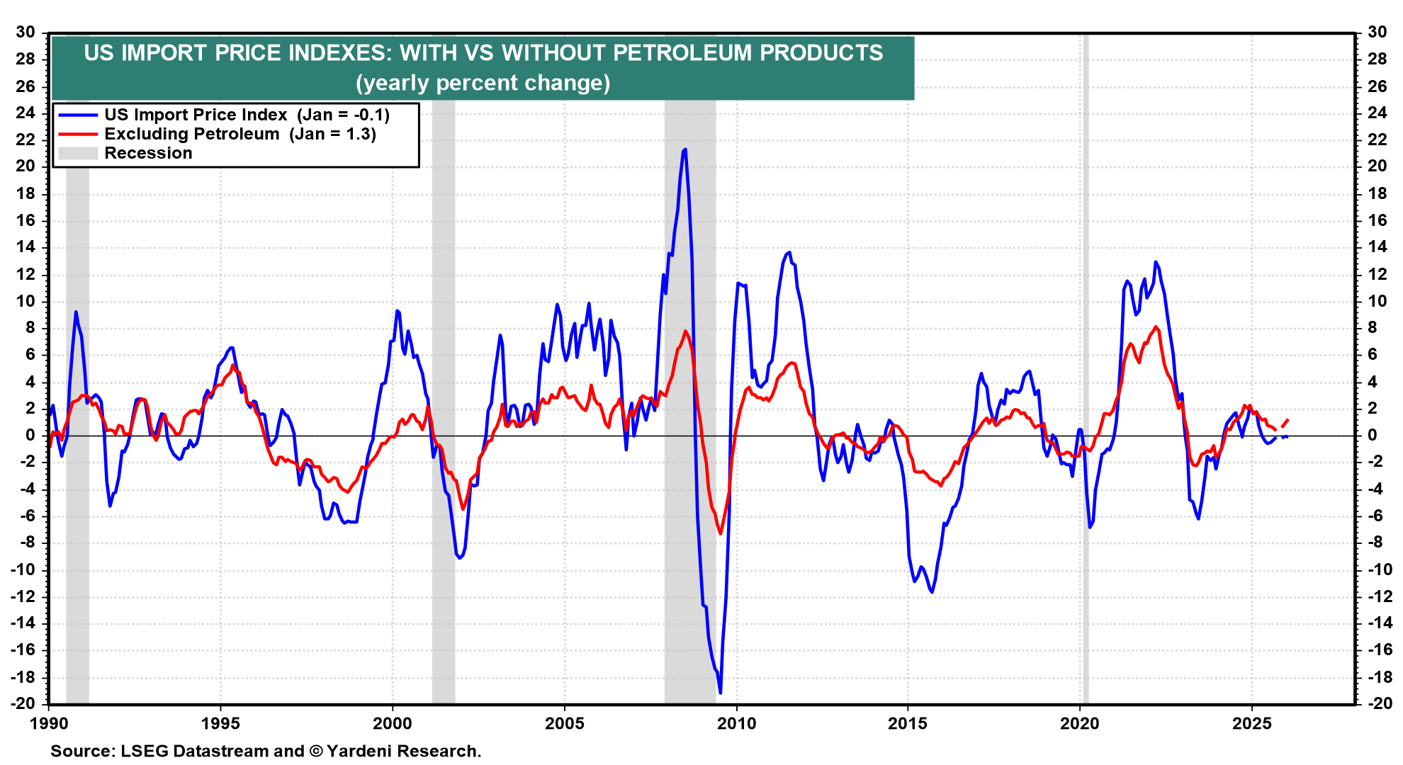(2) Import/export prices. The February import price data (Wed) follows January’s 0.1% m/m decline (chart). This is a pre-war report, so it won’t reflect the jump in commodity prices during March. Q4 productivity and labor cost data (Tue) should confirm that both were disinflationary last year. We expect to see more of that in 2026.