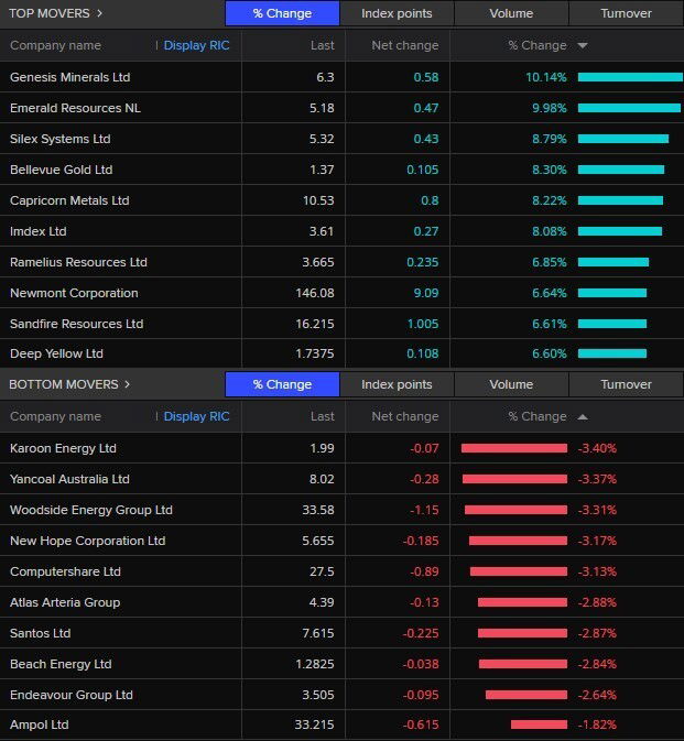 Gold miners like Genesis Minerals, Emerald Resources and Bellevue Gold were the standouts at open, rising in the range of 8% to 11%, as the price of spot gold gained ground.