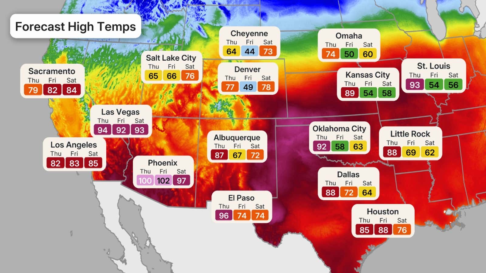 A late week cold front should remove the heat from the Plains and Rockies, however, above-average warmth will rebuild back into the Plains, South and Midwest this weekend.