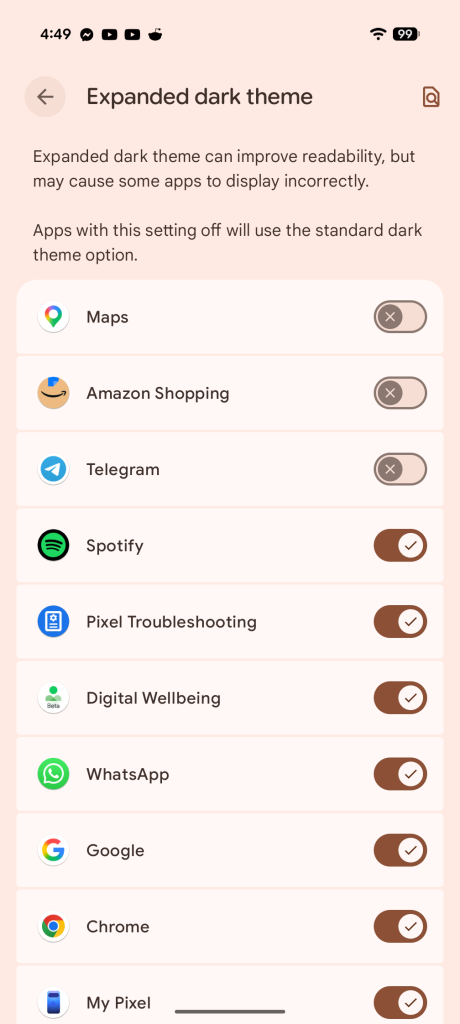 Starting with Android 17 Beta 3, “Expanded” dark theme now has a per-app setting that lets you disable the forced dark mode if a specific app doesn’t work well. It’s a welcome addition as, while it’s nice to be able to use dark mode across all apps, it just doesn’t work all that well in some places.