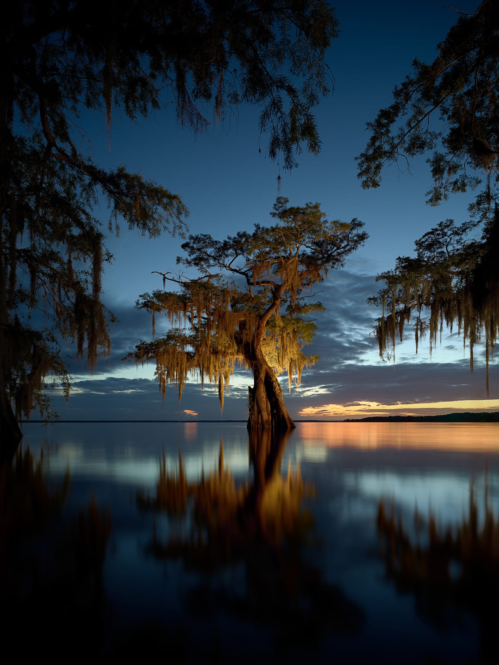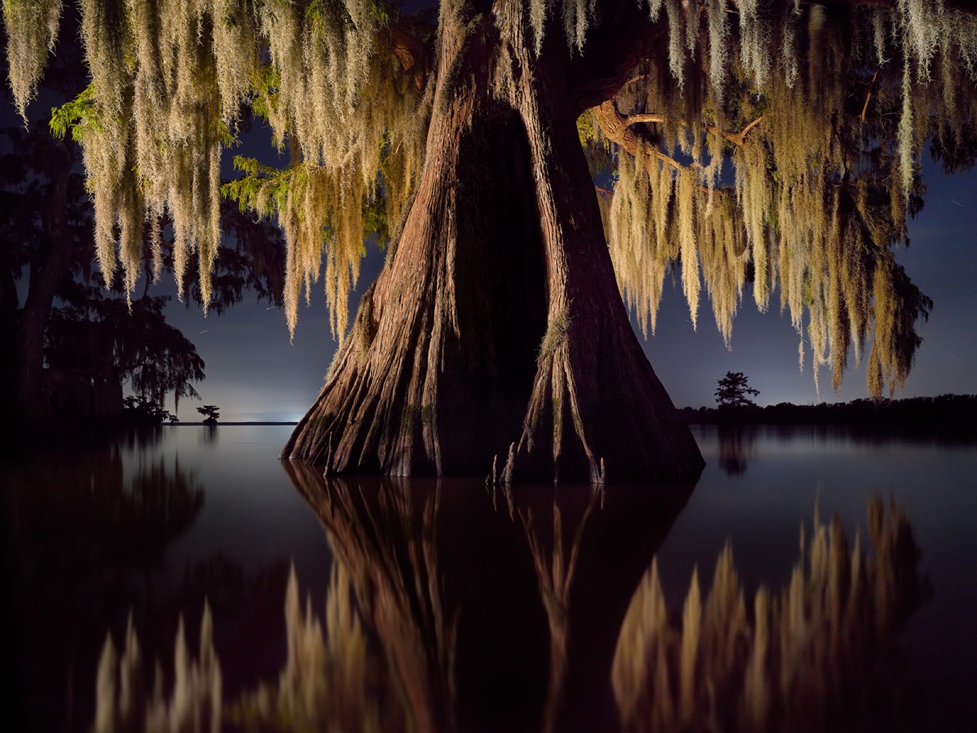 Relle’s series Until the Water explores Louisiana’s otherworldly bayous through a lens of serene reverence. He places lights beneath boughs and trunks, illuminating trees against darkening horizons to emphasize their billowing shapes amid expansive wetlands distinctive to the Gulf Coast region of North America.