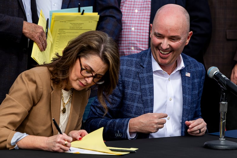Gov. Spencer Cox, right, smiles as Lt. Gov. Deidre Henderson, left, signs a ceremonial copy of a bill during a news conference in north central Tooele County announcing Utah’s intention to compete to bring a federal nuclear campus to the county on Friday, March 27, 2026. | Rio Giancarlo, Deseret News