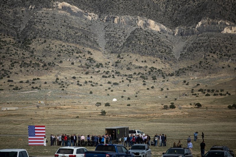 People gather for a news conference in north central Tooele County announcing Utah’s intention to compete to bring a federal nuclear campus to the county on Friday, March 27, 2026. | Rio Giancarlo, Deseret News