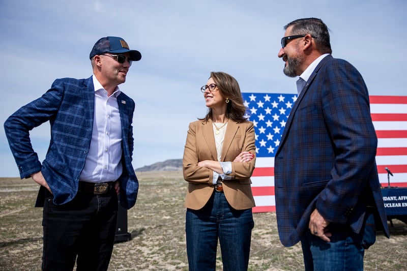 Gov. Spencer Cox, left, and Lt. Gov. Deidre Henderson, center, speak with state Sen. Derrin Owens, R-Fountain Green, right, before a news conference in north central Tooele County announcing Utah’s intention to compete to bring a federal nuclear campus to the county on Friday, March 27, 2026. | Rio Giancarlo, Deseret News