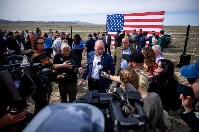 Gov. Spencer Cox speaks to media after a news conference in north central Tooele County announcing Utah’s intention to compete to bring a federal nuclear campus to the county on Friday, March 27, 2026. | Rio Giancarlo, Deseret News