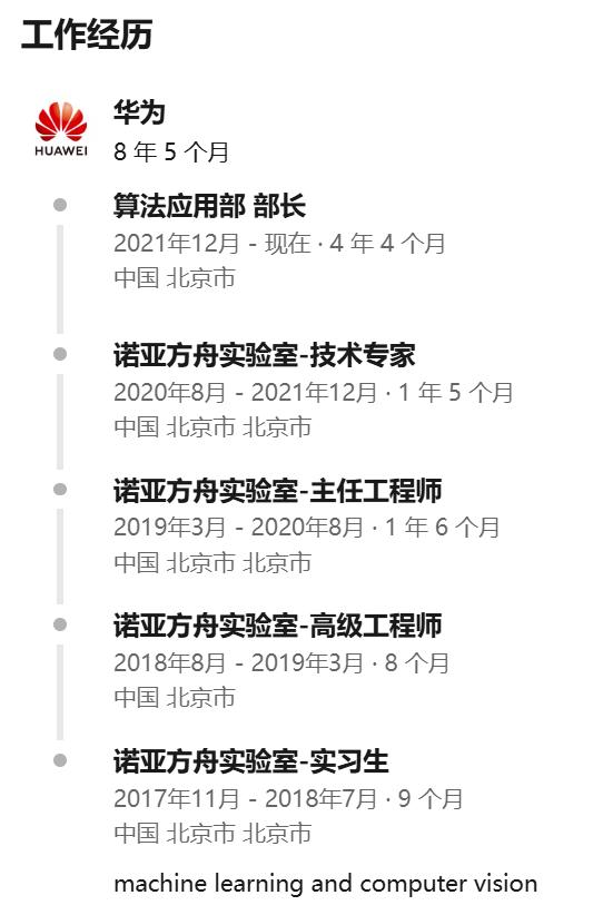 He interned at Huawei’s Noah’s Ark Laboratory before graduating from Peking University and naturally joined it after graduation, serving as a senior engineer. Later, he was successively promoted to chief engineer and technical expert.