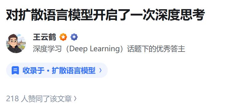 As an excellent answerer in the deep learning topic on Zhihu, Wang Yunhe also often shares his insights on topics such as the core architecture of AI. For example, on January 24 this year, he published an article titled “A Deep Thinking on Diffusion Language Models” on his personal Zhihu account. In this article, he in – depth explored the potential and technical bottlenecks of diffusion language models in the field of text generation.