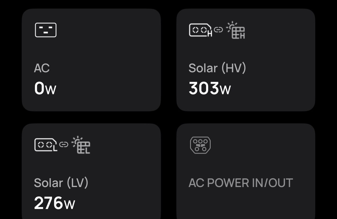 The output from the Sora 500, plugged into the LV (low voltage) solar input of a EcoFlow Delta Pro 3 solar generator, dropped to just 50W when shading the four center panels. You can see my roof-top panels producing 302W on the HV input.