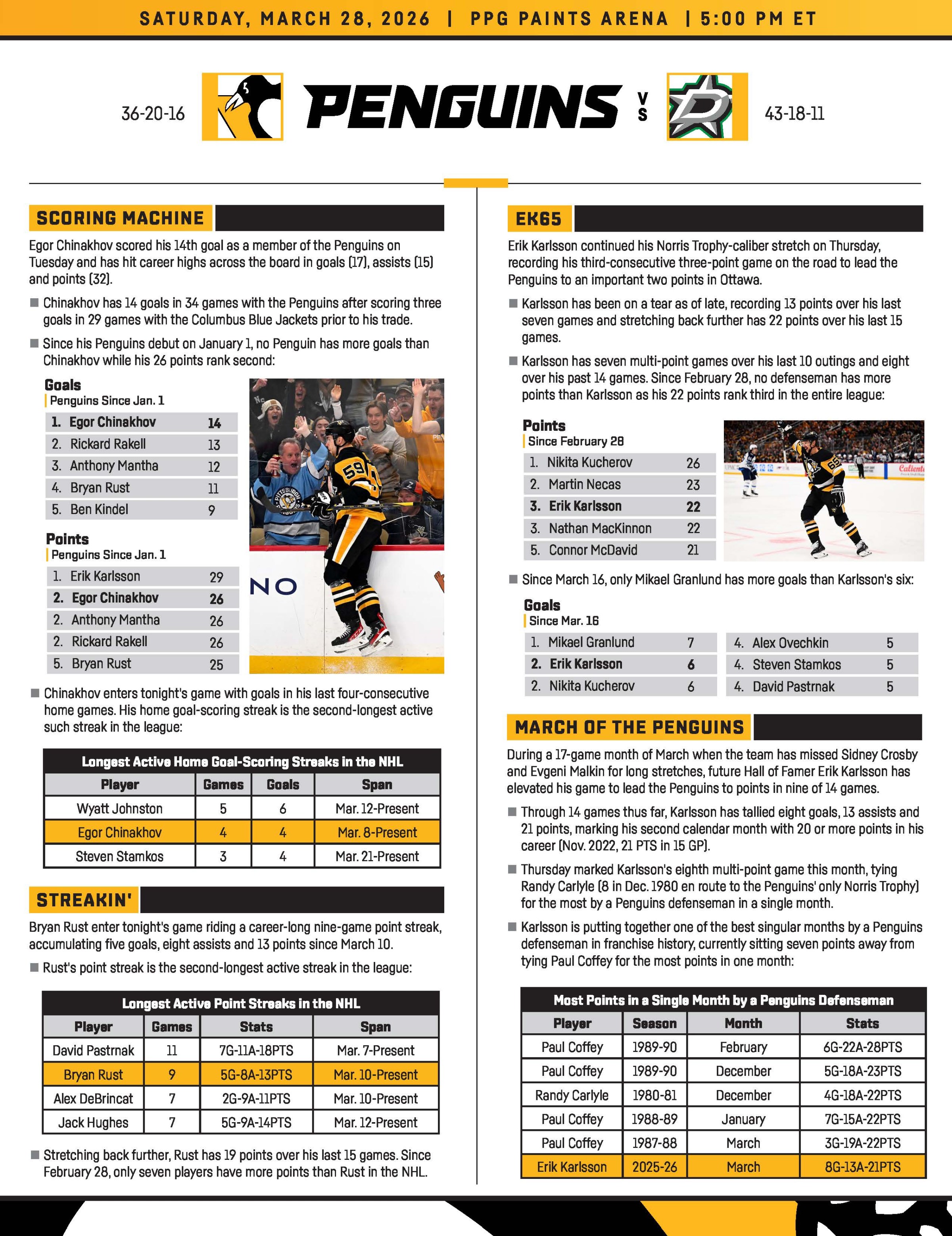 The Pens canceled a practice yesterday, so we’ll have to wait and see for this morning on any updates on the status of Crosby. If Crosby can’t play, it’s possible that Joona Koppanen will be in the lineup as a bottom-six center. The team could also opt to shift Rickard Rakell or Noel Acciari to center for the day and insert a winger like Avery Hayes into the lineup. Depending on Crosby’s status it could be a very fluid situation with a couple different options on how they want to go about patching a lineup together.We’ll also await word on Evgeni Malkin, officially day-to-day with an undisclosed injury (believed to be in the finger/hand area). Malkin did not even travel with the team to Ottawa for Thursday’s game which might not bode well for his availability just a couple days later.Bryan Rust is currently in the midst of a career-long nine-game point streak (5G-8A) and has points in 14 of his last 15 games played (7G-12A) dating back to Feb. 28th, per Pens PR. Rust’s streak is the second longest active one in the league behind Boston’s David Pastranak (11).Sam Girard is set to play in career game No. 600 today. Not bad for a guy who won’t turn 28 until May.Whether or not the goalie rotation continues will be interesting as well, Skinner has been performing much better than Silovs lately — but the team has other considerations in mind with a massive set of games on Monday/Tuesday against NYI and Detroit. They may want to keep Skinner fresh and in rhythm for that Monday game by not leaning too hard on him today, which would make Monday his third game in five days. They may also not want Silovs to have his next action come on Tuesday and have him go a full week between starts by skipping him today. Lots to weigh and consider for that decision on who plays in goal today for the Pens with more variables in mind than simply this one game.