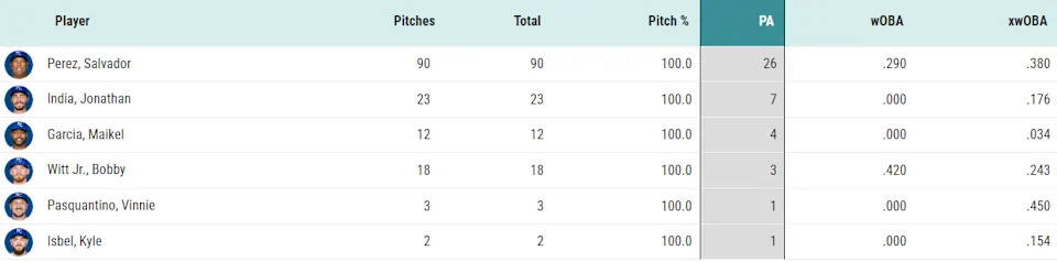The Royals lineup has a similar-ish level of familiarity with Reynaldo Lopez (42 PAs), with more than half of those courtesy of Salvador Perez, who spent a long time facing off against Lopez in the AL Central. Perez has a .380 xwOBA off the right-hander, but just a .290 wOBA. No one else really has enough PAs to be worth mentioning: